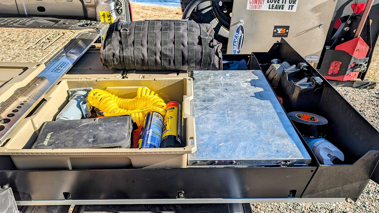 Decked claims these changes add 30 percent more available volume inside a 5-foot bed like mine. That’s an enormous difference. Where I pretty much maxed out any available room in the old system with essential tools and supplies I feel I need to carry all the time (Boy Scouts really hammered that “be prepared” message into my still-elastic brain at an early age), loading that same stuff into the new drawers leaves about one-third of the drawer space and the entire side areas open. That means I can move several bulky items of camping gear inside the drawer and under the side load surfaces, freeing up equivalent space inside the GoFastCamper that caps my bed.