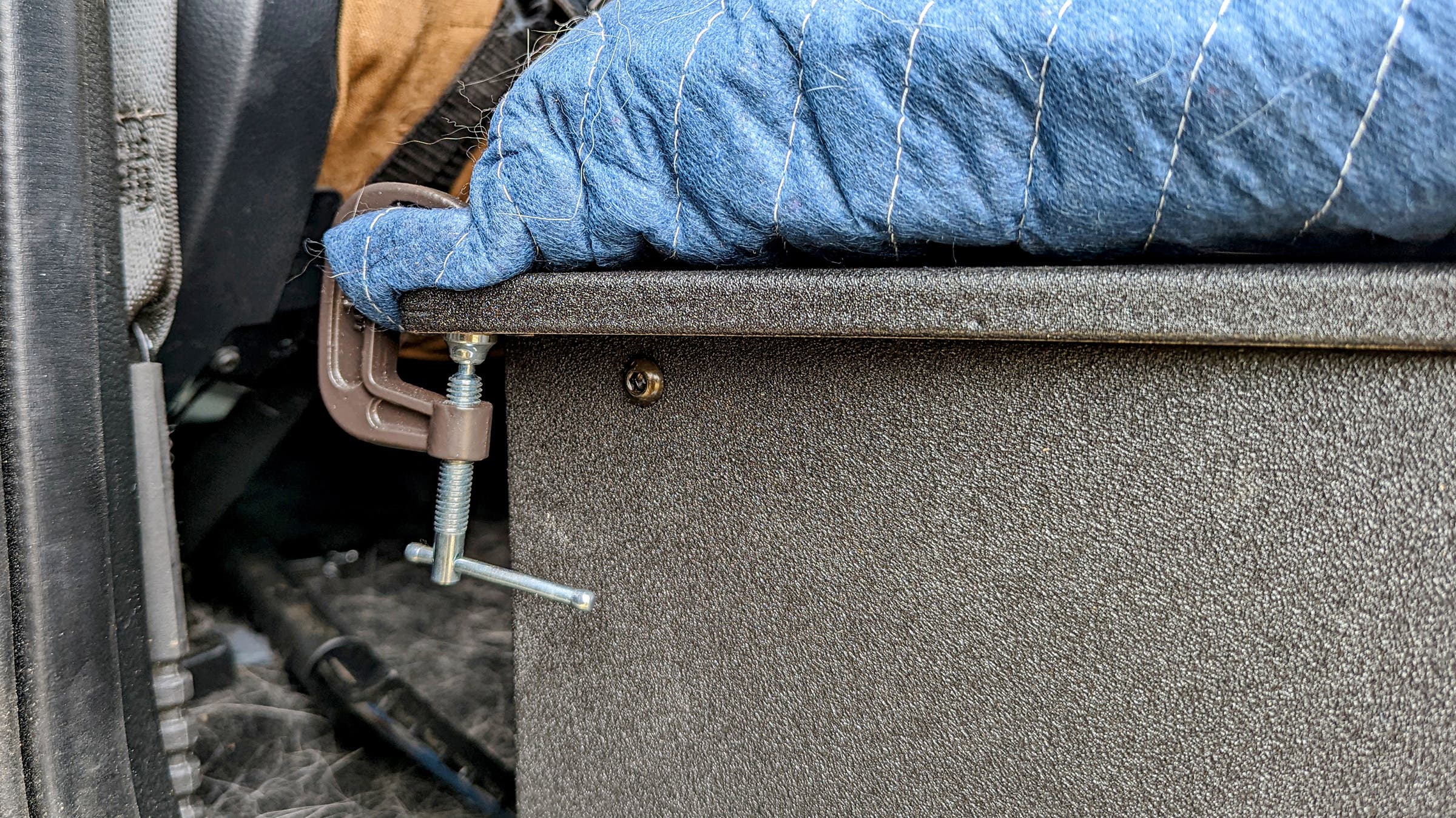 Acting on a tip from Kelly Lund, who owns the Insta-famous malamute-mix Loki, I cut a two-inch memory foam mattress topper to match the dimensions of the plate system, wrapped it in a Harbor Freight moving blanket, and secured it all to the plate floor with one-inch C-clamps. I’ve found those moving blankets almost comically good at handling all the fur and liquids expelled by dogs, and at $12, they’re cheap enough that you can just replace them when the fur and liquids inevitably win the battle.