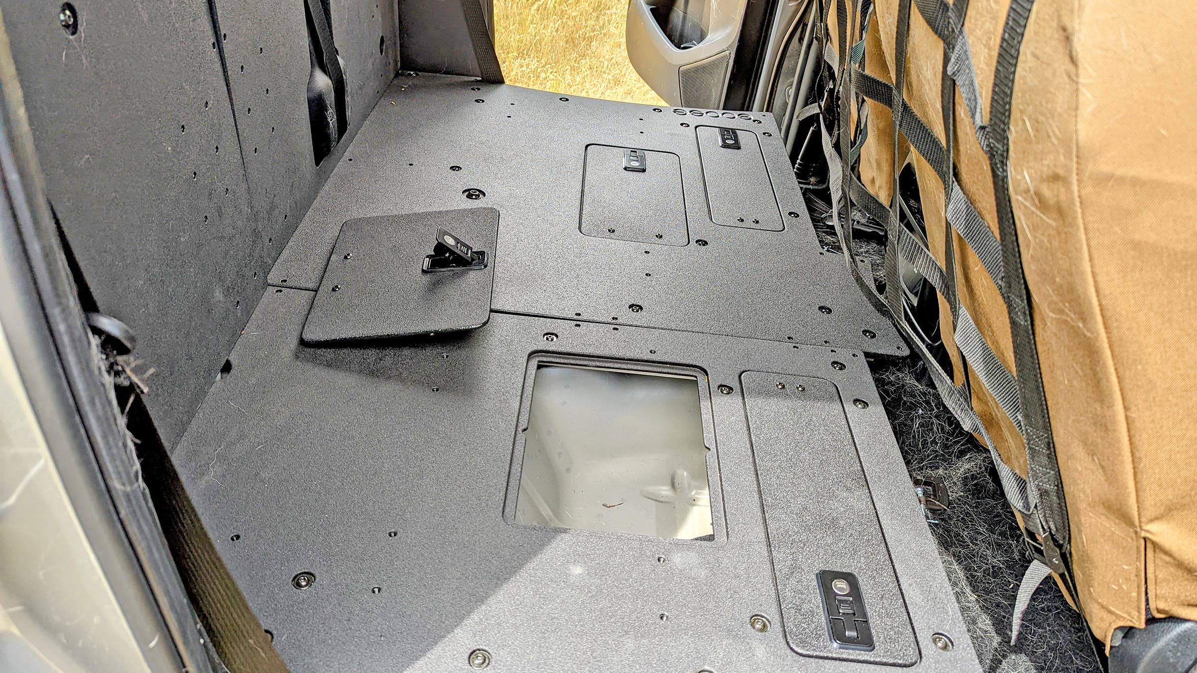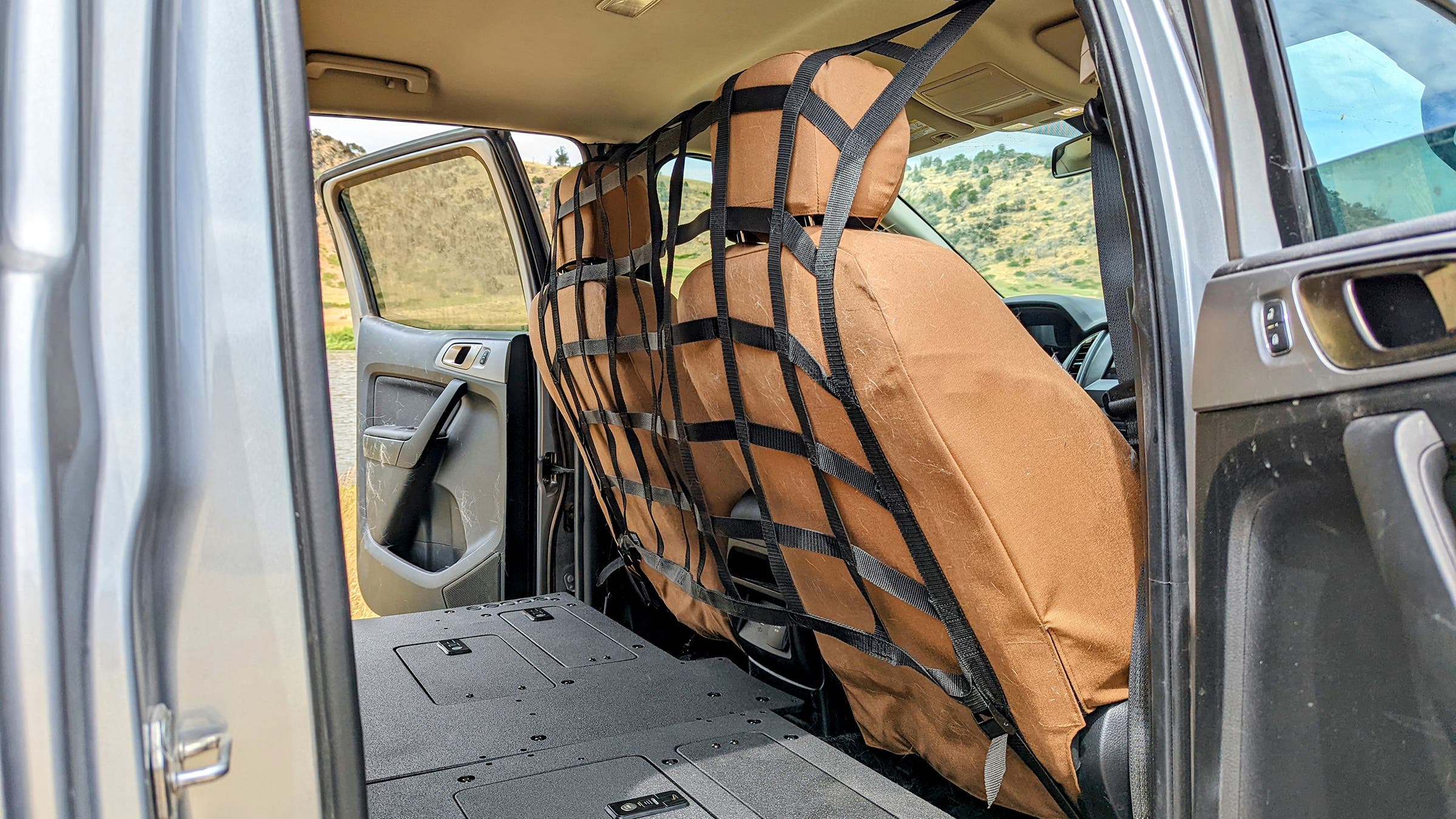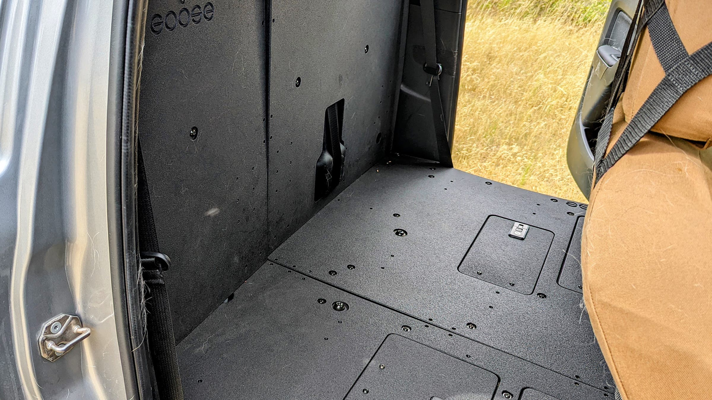 Pulling a set out of a vehicle doesn’t typically result in a clean, flat load surface. Instead, there are usually voids, fragile parts, exposed hardware, and other stuff that may cause problems when filled with dogs. But a company in California called Goose Gear specializes in plate systems that bolt in place of your seats, creating that ideal flat, square surface, while maximizing space. They’re designed for cargo, not dogs, but are plenty strong, and with a little creativity, can easily be adapted to canine use.