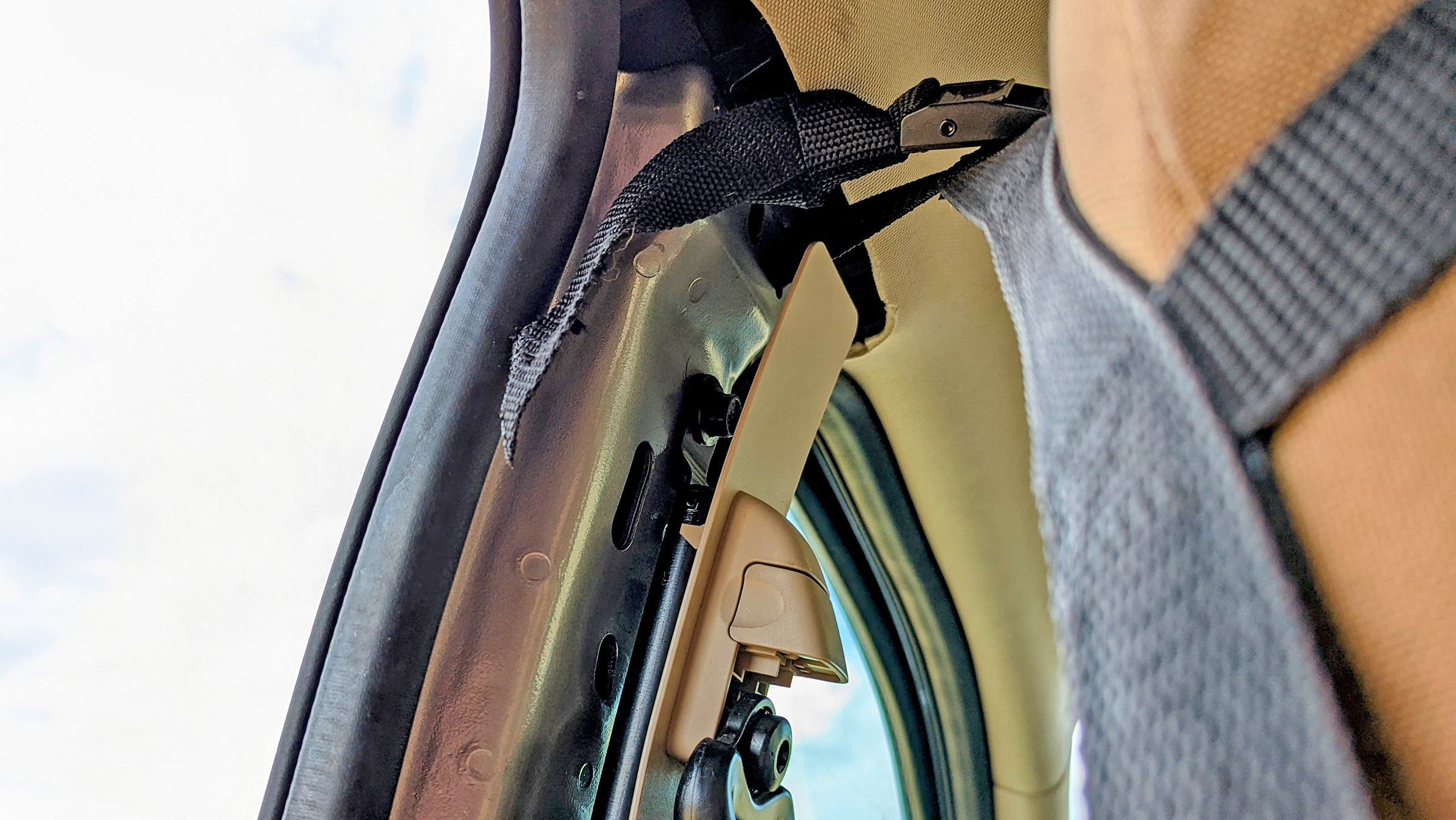 There are two problems: your vehicle’s plastic trim and the position of the seats. Raingler, which actually includes instructions with its products, suggests that you remove the plastic B-pillar trim, then drill holes into your steel frame from which you can hang a mounting tab for the net. The Ranger’s trim interferes with that mounting tab, so I just pulled the trim out entirely, and passed the net through pre-existing holes in the steel. The result is an ugly, if effective solution.