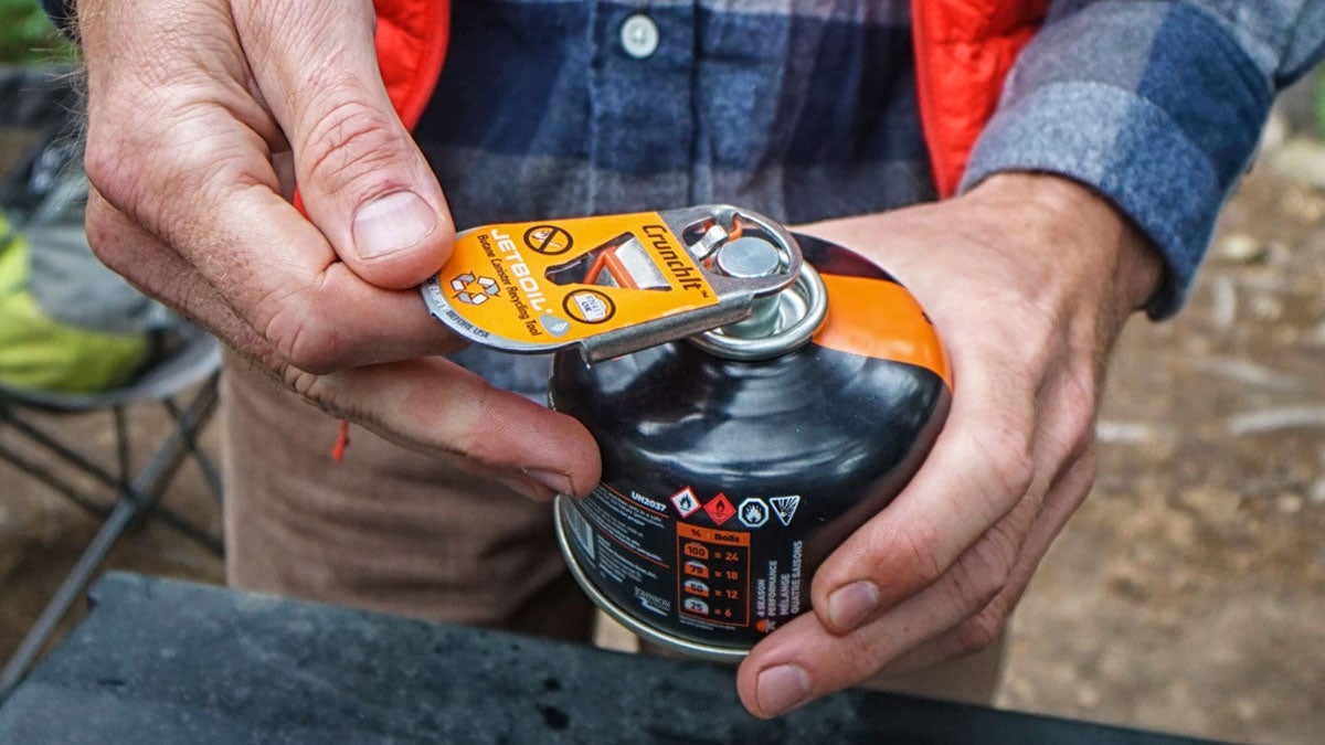 When it comes time to recycle a fuel canister, use the the Jetboil CrunchIt tool to release all remaining fumes from the top nozzle. Once there’s no propane left, use the same tool to puncture a small hole in the canister using the integrated wrench. This allows it to be recycled properly, as machines can’t process pressurized containers. After making the hole, write “Empty” on the canister in bold black marker to give the workers at the recycling facilities a clear indication that it’s safe. If they question that it’s empty, its safer for them to throw it away than investigate. And check your local recycling regulations, since most canisters are made of stainless steel, which many curbside pickup services don’t accept. You may need to drive spent canisters to a special drop-off location.
