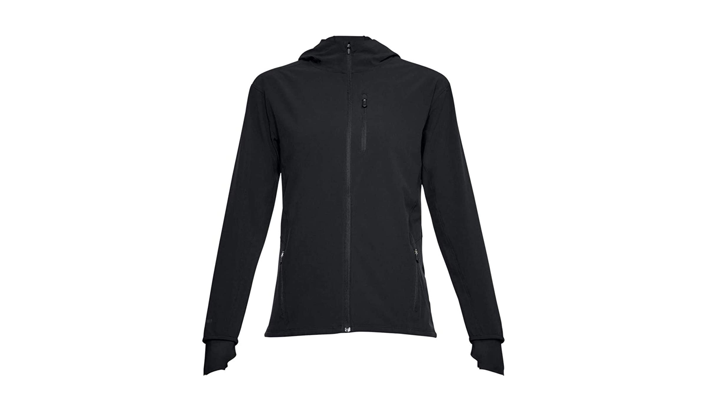 This jacket is water-resistant, but it lacks a membrane to seal out drizzle for extended periods. Still, we love it for rainy-day running, because the superior breathability ditches sweat during speed work, and the stretchy blend of polyester and elastane feels soft on skin. A DWR finish, articulated cuffs, and a protective hood keep showers at bay. It all adds up to a suitable companion for your daily endorphin chase. 12 oz (men’s, pictured) / 10 oz (women’s, pictured).