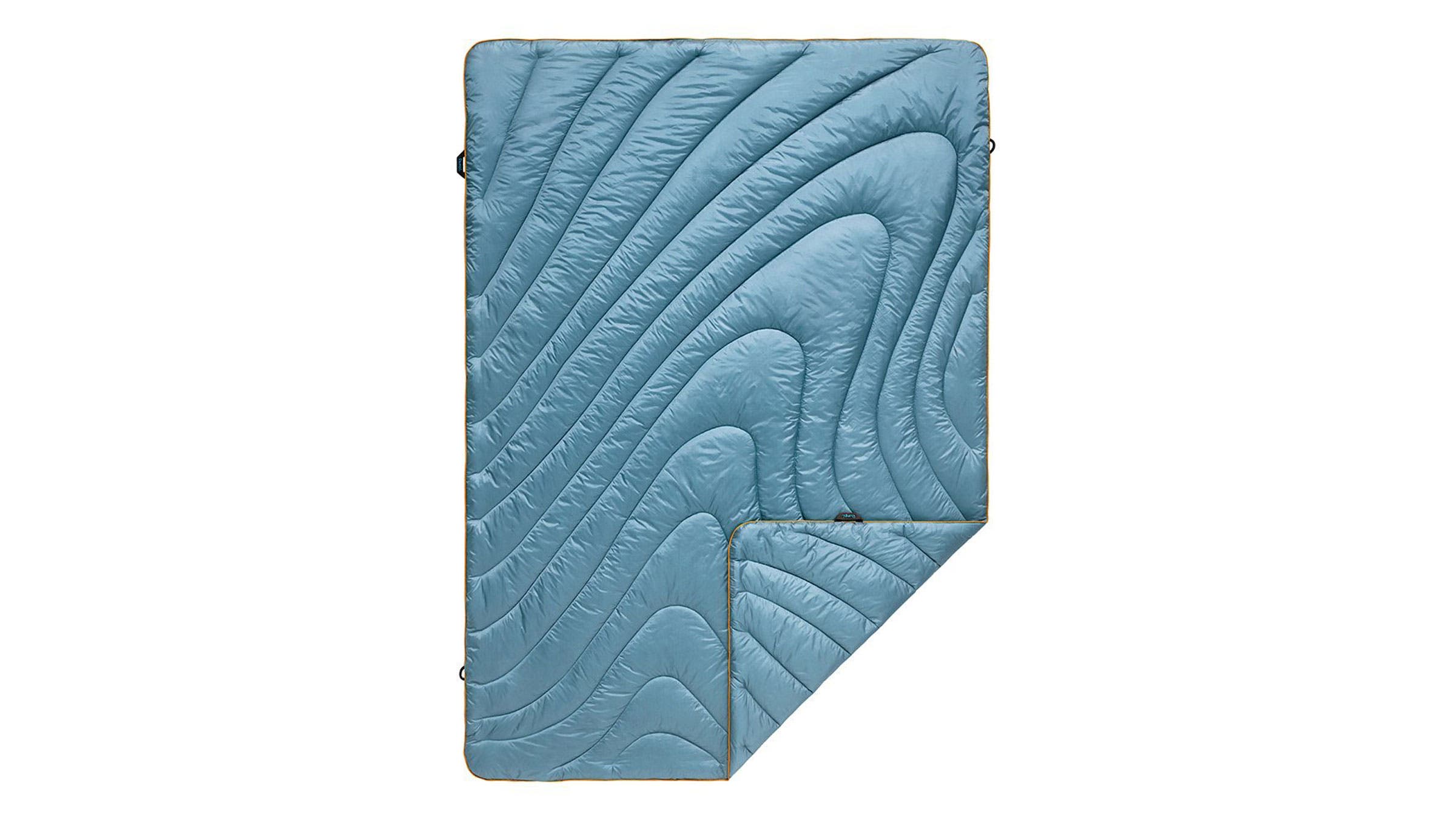 Rumpl’s original puffy blankets are like wrapping yourself in a warm hug. They’re lightweight, durable, and they stand up to outdoor use. The weather-resistant blanket is treated with a durable water repellent (DWR) finish, and both the ripstop shell and the synthetic insulation are made from 100 percent post-consumer recycled materials. The cape clip on the single-person blanket is my favorite feature, and the stuff stack is nice for tucking it away when not in use.