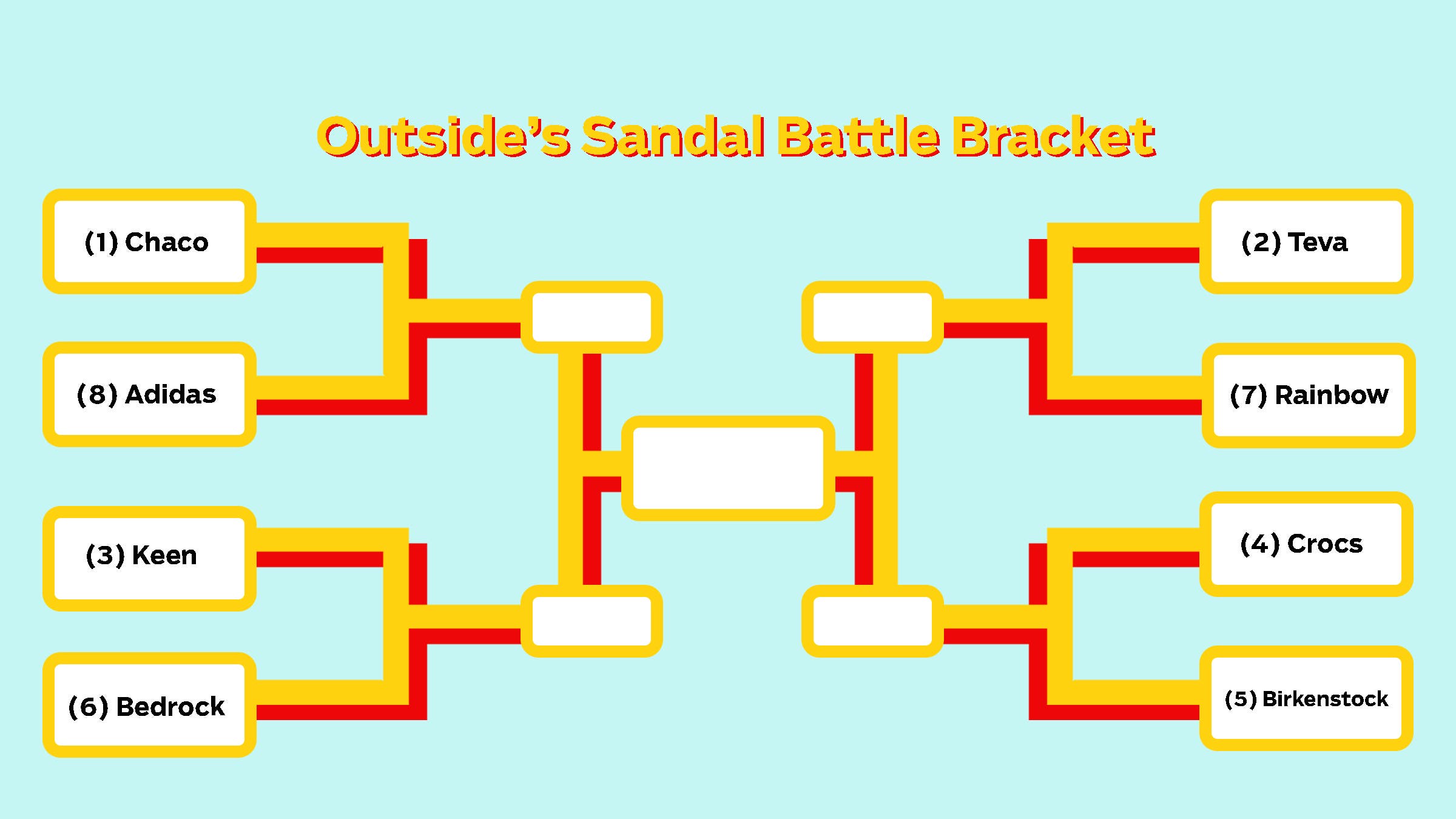 You’ll have a week to vote for eight fan favorites in three rounds: the elite eight, the final four, and the championship. Check out our bracket, below, where you’ll see how we’ve seeded each brand of sandal, noted in parentheses in the following matchup descriptions. (Also, check out our collections page, where you can find our editors’ essays and odes about their favorites.) We’ll recap each round, dissecting the winners and losers, the sleeper picks and the upsets. When the voting is done—check back regularly for updates and for the outcome—all of those beer-fueled debates around the campfire about lugs and waterproofness and versatility will be pointless, because there will be an undisputed winner. So cast your vote. If not for yourself, for your feet, and for bragging rights.