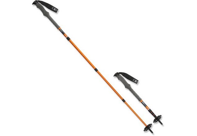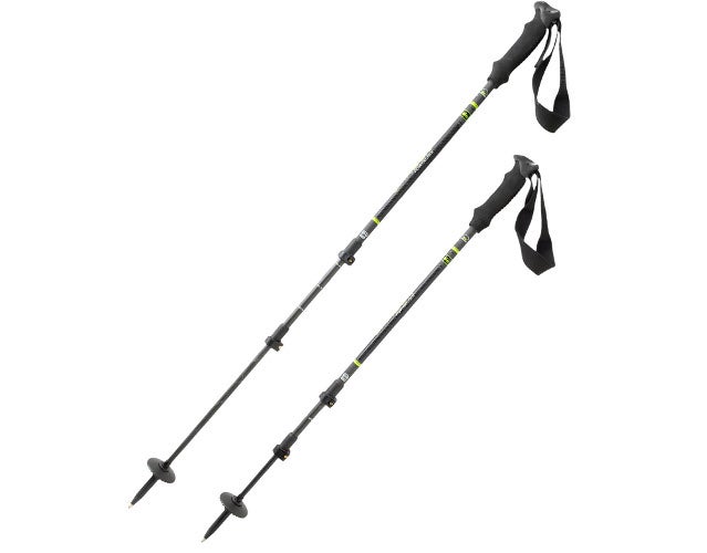 In the photo above, it looks like these trekking poles are made specifically for people who have one arm longer than the other. The image is really to illustrate the adjustability of REI’s Carbon PowerLock trekking poles ($130), which can be set from between 27.5 and 55.1 inches. (And occasionally steep trail conditions warrant adjusting one side higher than the other.) As the name suggests, REI uses carbon fiber to dampen vibration and provide strength, while reducing the weight to a low 14.6 ounces. They come with tungsten carbide tips, ergonomic foam handles, and baskets near the end, which can help with stability in boggy terrain. The poles won’t slip under pressure, thanks to the PowerLock II mechanism, which provides a wide area of pressure against the pole walls and are easy to set: even when wearing gloves, you lock the poles by simply twisting to the right.