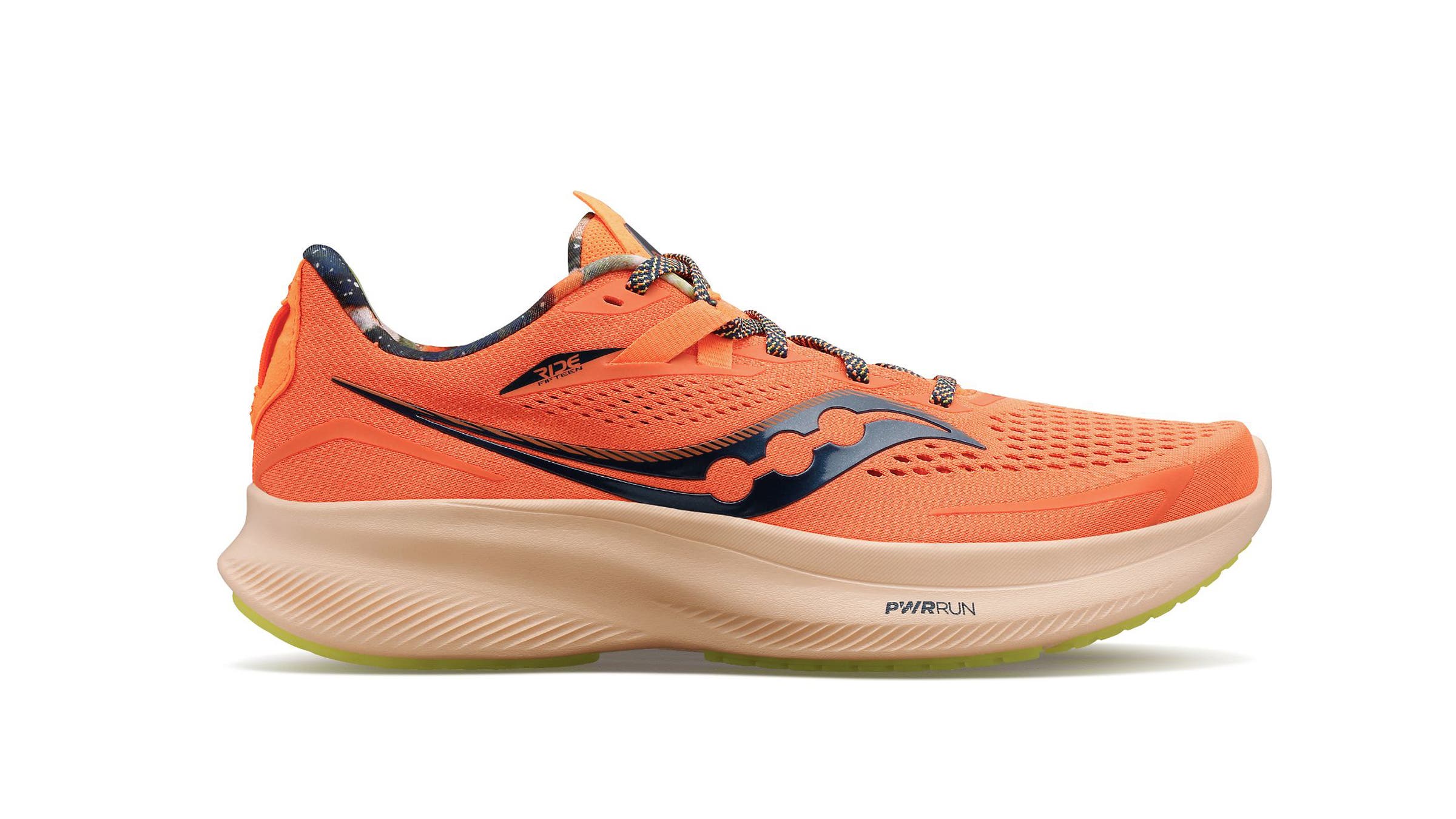 Marathon trainers tend to err on the heavy, boring side, because distance runners are after ample cushion and support. But the Ride 15 isn’t that kind of shoe. This version is an ounce lighter than the previous iteration, and new midsole foam provides greater stack height, for a faster but still comfortable ride. The footbed is set slightly into the midsole, creating a foot-cradling effect we appreciated. Plus, a beveled heel and toe-spring shape contributed to notably smooth transitions. (Men’s 8.8 oz, women’s 7.8 oz; 8 mm drop)