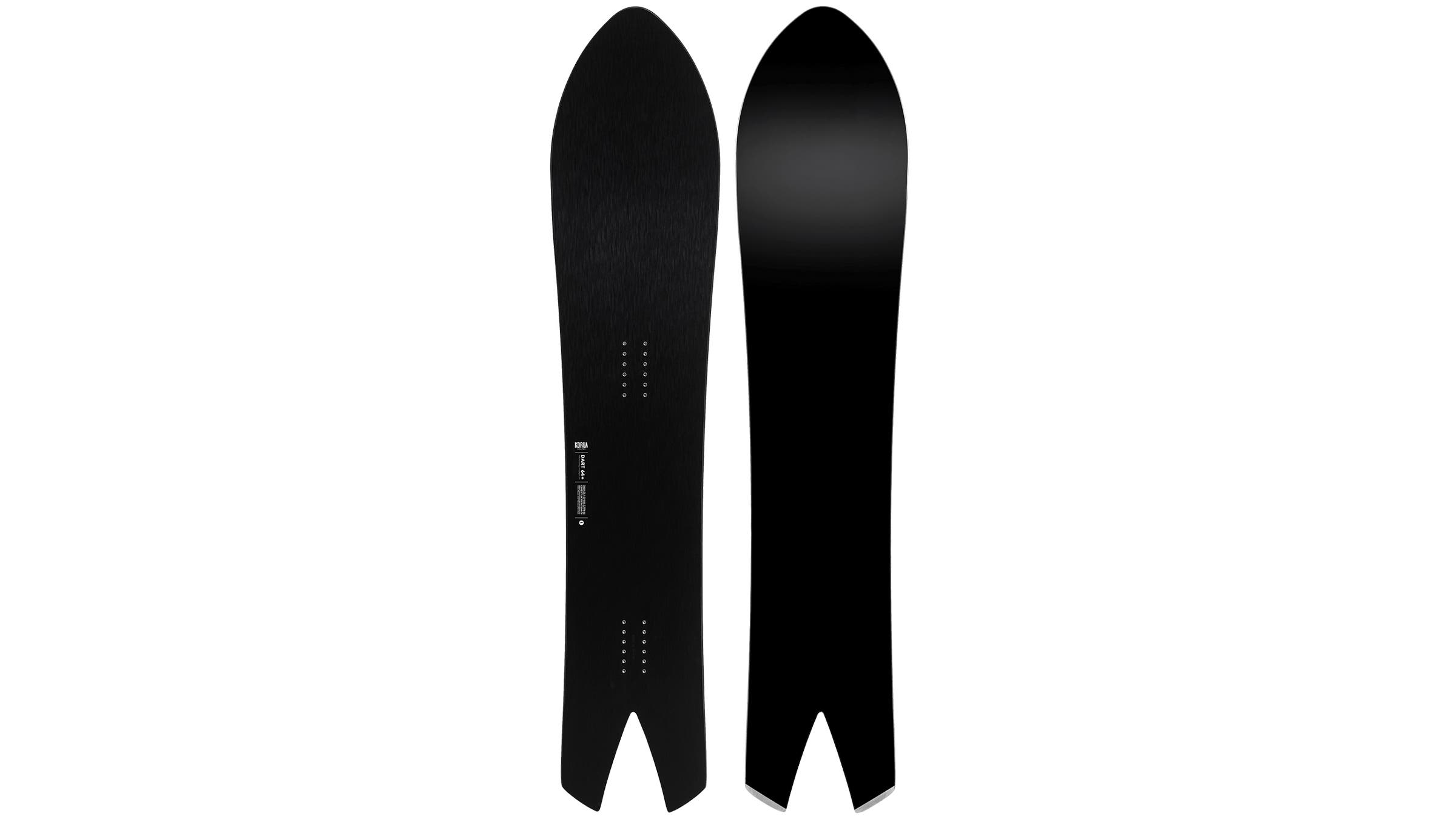 Korua’s affordable yet critically acclaimed Dart has been a popular pick for surf-addicted powderhounds and carving specialists for a few years now, but this season the boutique German board builder unveiled the Dart Plus. “Plus” doesn’t mean beefier dimensions, but more premium materials. The classic Dart shape remains the same: a broad, rockered nose; a wide, cambered midsection; and a relatively petite, tapered backseat notched with a sultry swallowtail. Upgrading to the Plus, however, gets you a faster base, lighter, slightly stiffer carbon layup, and a tantalizing black topsheet.