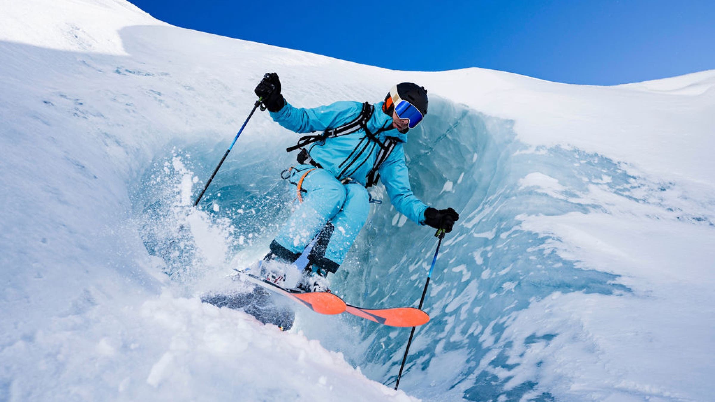 Freedom of movement, especially in the legs, allows for transitions from ski to climb seamlessly. I like to wear them with enough room so all the various movements through an expedition are effortless. Breathability is very important, and it’s reflected in the technology. (With a breathable jacket, I never open the vents.) Pockets must be accessible and large enough to store equipment easily, and I’m increasingly using water flasks that I place along my body to keep the water temperature constant—water stored in the bag becomes very cold, and I don’t drink it. The combination of mobility, breathability, and storage enable one to discover the flow state while in the mountains.