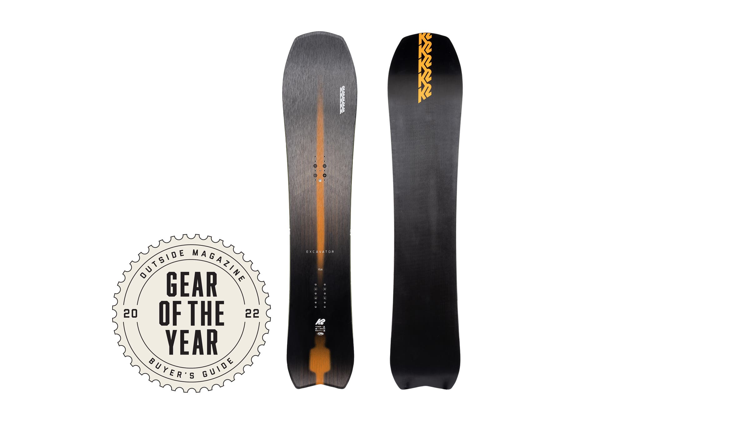 Last year, K2’s Alchemist won our Gear of the Year award. This year, the brand’s wunderkind snowboard designer, J. Stone, has done it again with the Excavator, a contemporary carver that crushes corduroy, surfs slush, slashes through bottomless powder, and puts fun first. Genetically, the Excavator and Alchemist might be brothers. Both decks sport camber underfoot, rockered noses, bamboo backbones, speedy carbon-infused bases, and notched tails bolstered with carbon stringers for stability and snap. But the unisex Excavator is a fat “volume-shifted” shape, meaning it’s designed to be ridden several centimeters shorter than your everyday all-mountain board. It’s also softer and surfier than the torpedolike Alchemist. On snow, K2’s back-to-back winners ride more like distant cousins.