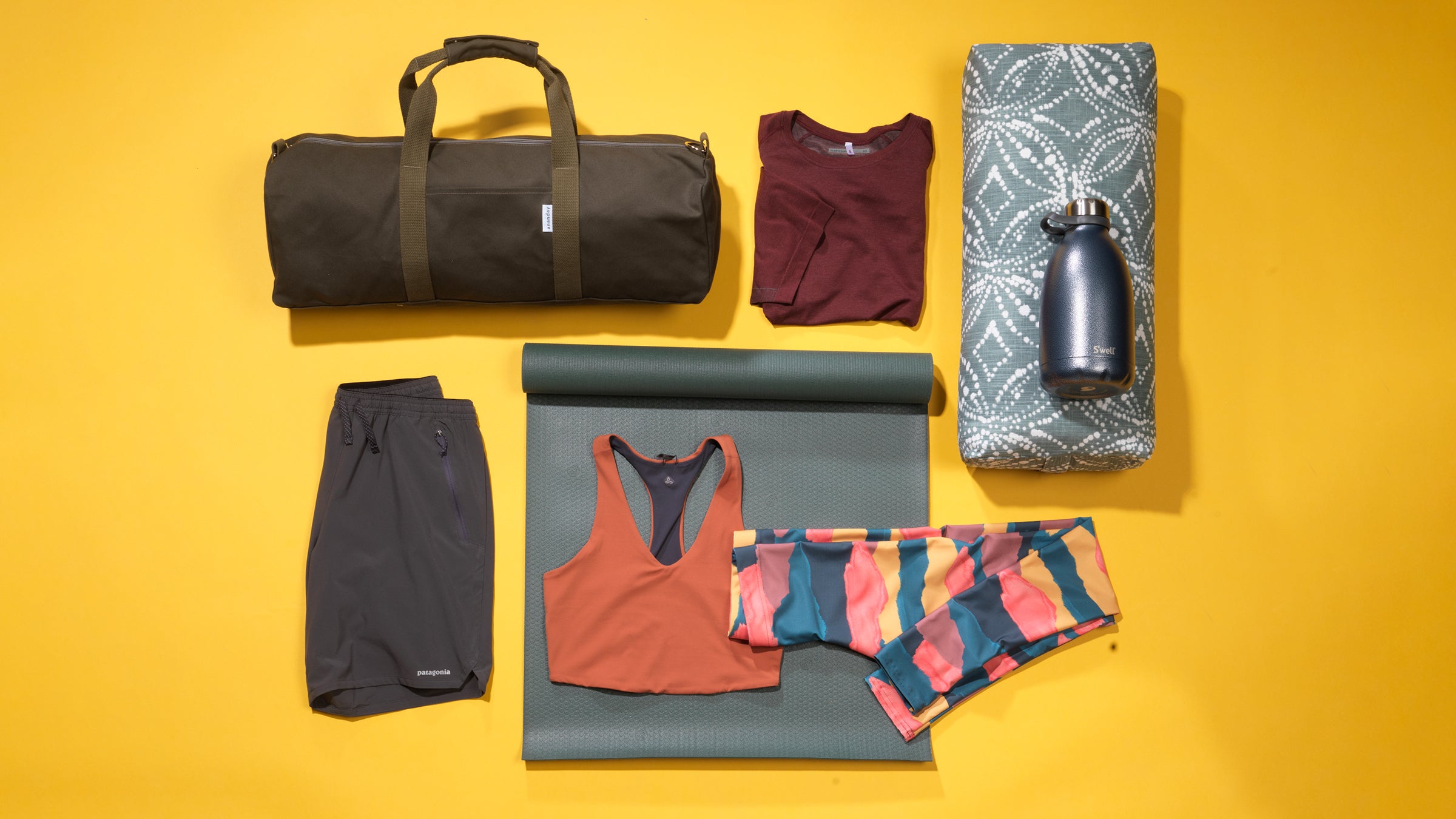 Tired of juggling your way into class? This duffel accommodates mats up to 24 inches wide and has plenty of room for props, clothes, and a water bottle. The external pocket organizes your phone, wallet, and keys, so you can focus on the oms.