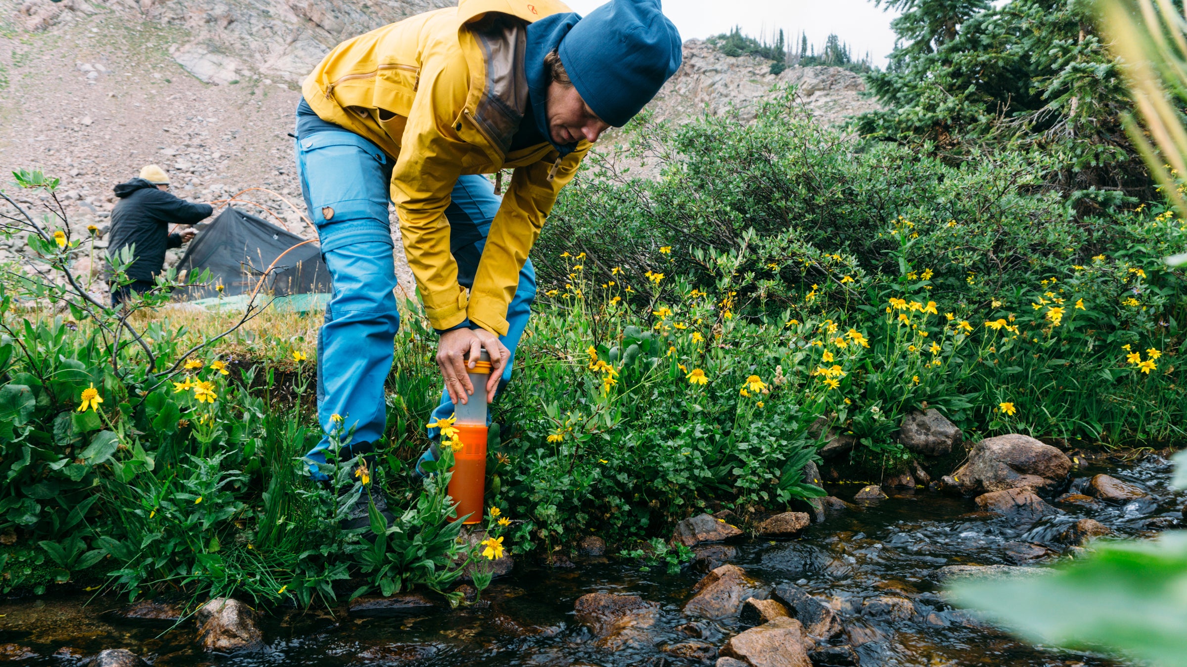 The Ultralight bottle is one of the simplest and most compact water purifiers on the market. Just fill the 16-ounce bottle from any stream or lake and press down. In less than 15 seconds, the water will be filtered and you can drink straight from the bottle. The replaceable carbon filter lasts for about 300 uses or 40 gallons of water.