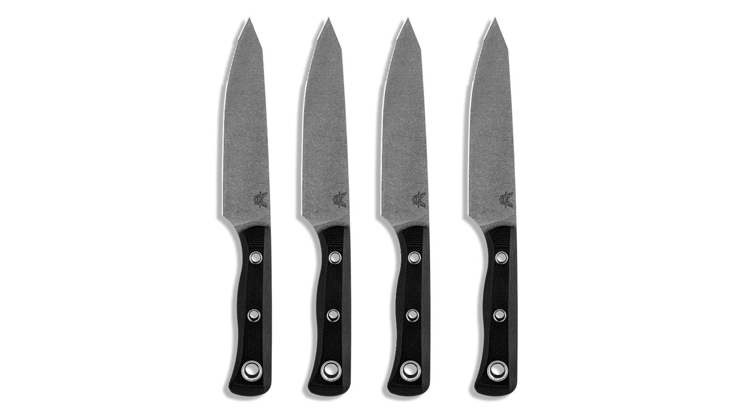Suitable both for kitchen prep and negotiating a juicy rib eye, the knives in this four-piece set feature a five-inch blade with a combined serrated and straight edge for maximum versatility. The steel, finish, handle, and engraving can all be customized for the chef in the family.