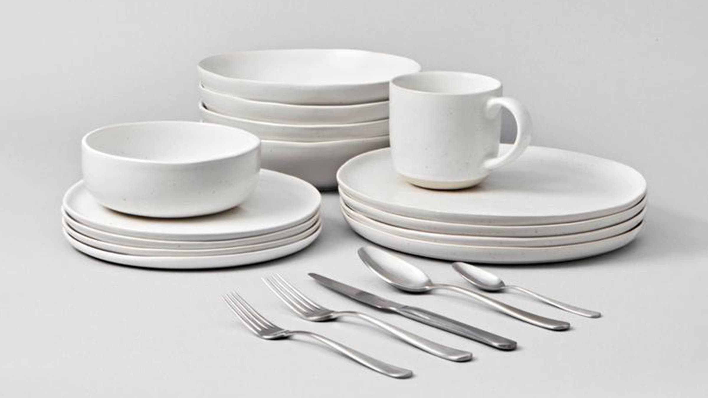 This simple, timeless set includes service for four—two bowls, two plates, and a mug—plus silverware. Each piece is crafted in Portugal, and the stoneware is made of recycled ceramics and local clay.