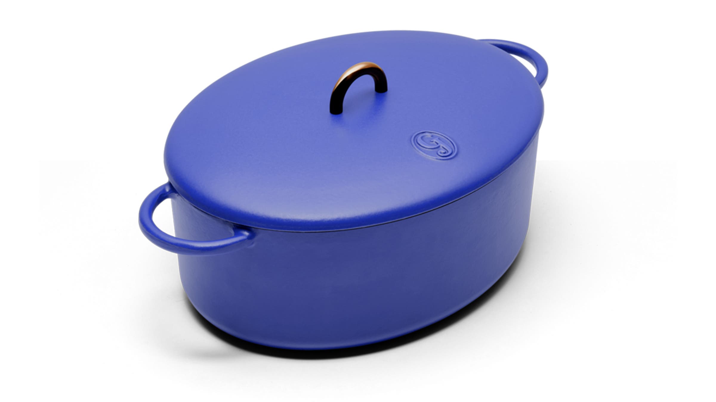 Add a splash of color to the stovetop with this cheery cast-iron cooker. The oval shape provides more surface for searing, the gray interior hides stains, and oversize handles afford ample space for oven mitts.