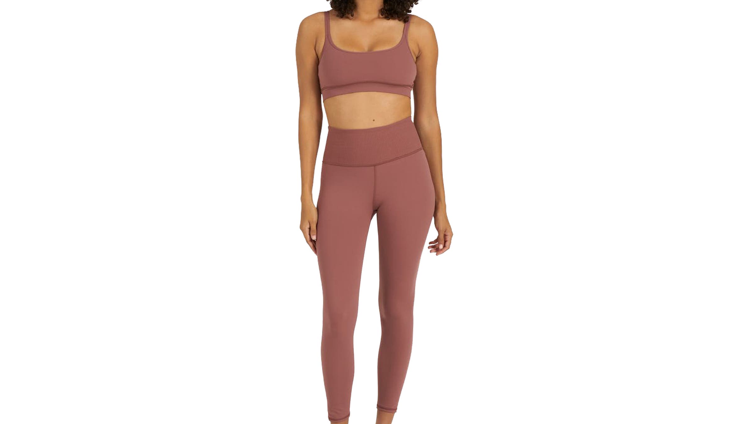 Vuori’s ultrasoft polyester-elastane fabric makes this set comfortable for any intensity of movement. Four-way stretch in the leggings permits a wide range of motion, and the super-high-rise, ribbed waist keeps everything tucked in. The bra offers light support and has removable pads. (XXS–XXL)
