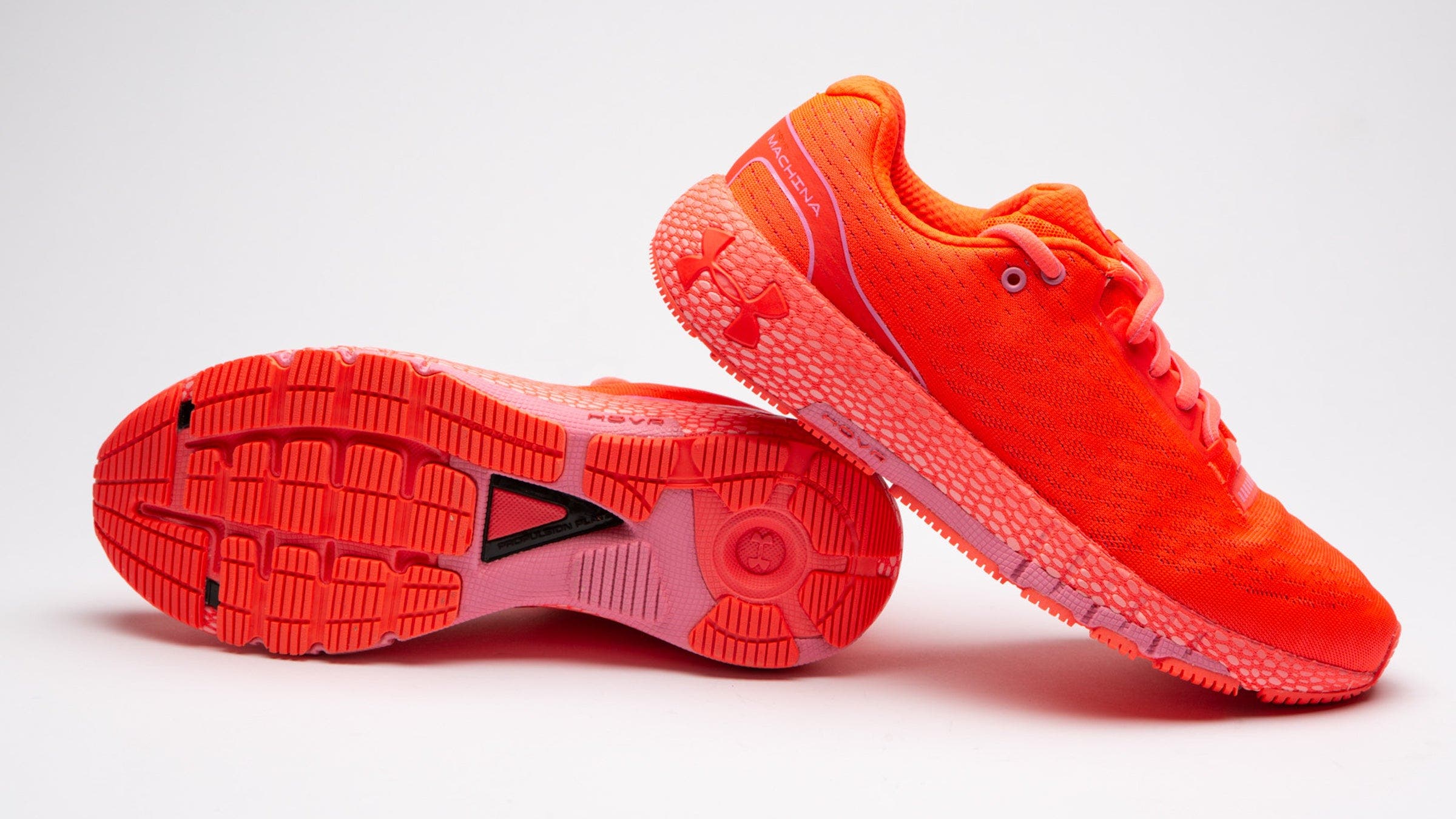 The HOVR’s energy-returning midsole features a two-pronged carbon-filled Pebax propulsion plate for quick transitions to the forefoot and toe-off. Comfort and pop also stem from the midsole mix of a waxy synthetic foam they call HOVR, that is both resilient and durable. The Machina, for the first time, has a full-width layer of that HOVR foam, open on the sides, which produces a responsive-while-plush “glide” you can feel on your first stride. Two testers said that this was the first Under Armour shoe they had tried and really enjoyed the ride.