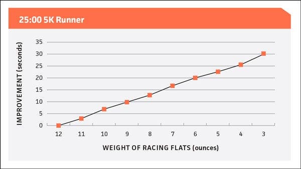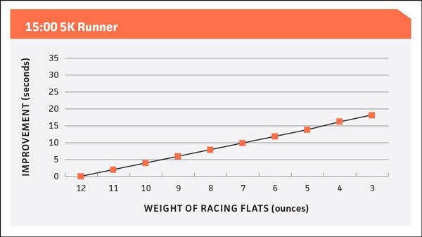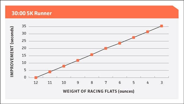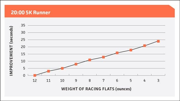 By switching from training shoes to the lightest, 4-ounce flats, a 20-minute 5K runner can cut about 24 seconds from his or her time. Even if already racing in 7–8-ounce flats, he or she can save 12 seconds by switching to the lightest shoes. A 30-minute 5K runner would gain 18–36 seconds. A 15-minute runner would improve 9–18 seconds.