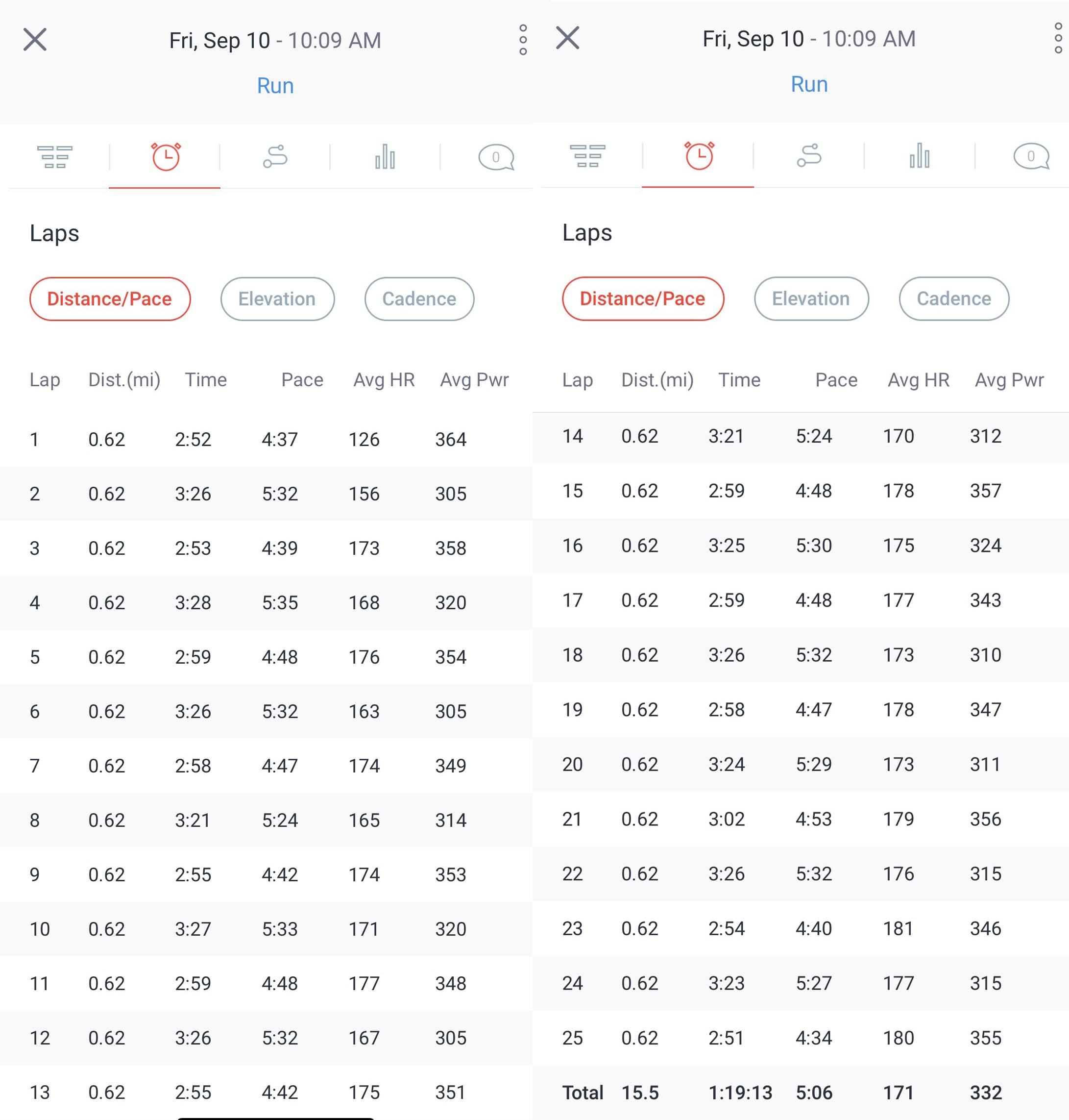 • Total: 15.5 miles in 1:19:13 (5:06/mile average pace)