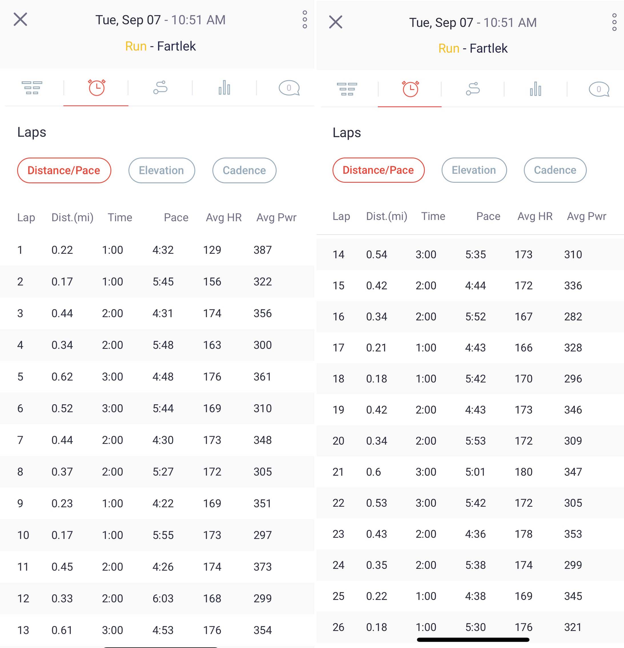 • 50-minute fartlek. 9.69 miles total, 5:09 average pace