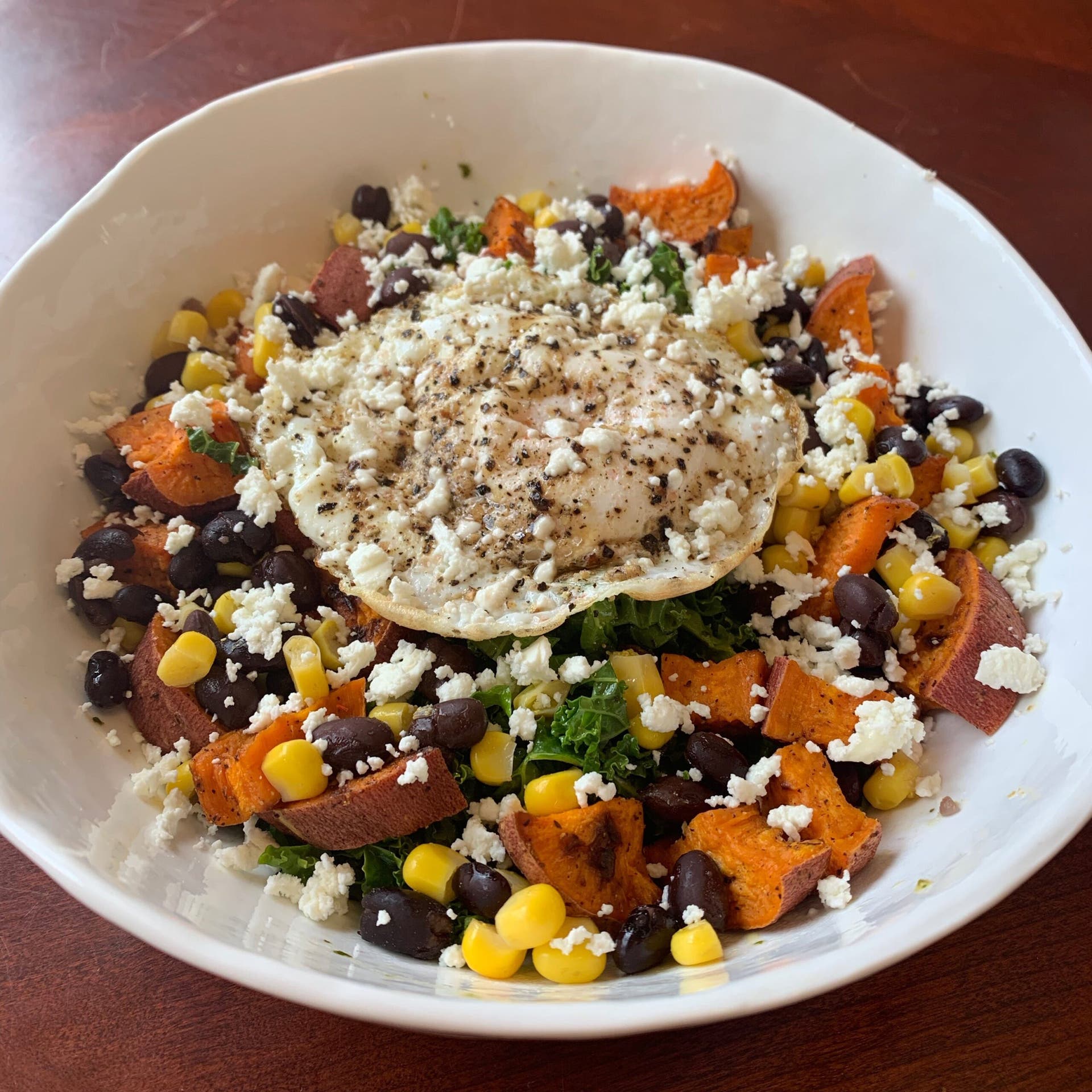 Lunch: Bowl of roasted sweet potatoes, black beans, corn, chopped kale, feta cheese, fried egg, homemade chimichurri (condiment made of cilantro, vinegar, olive oil)