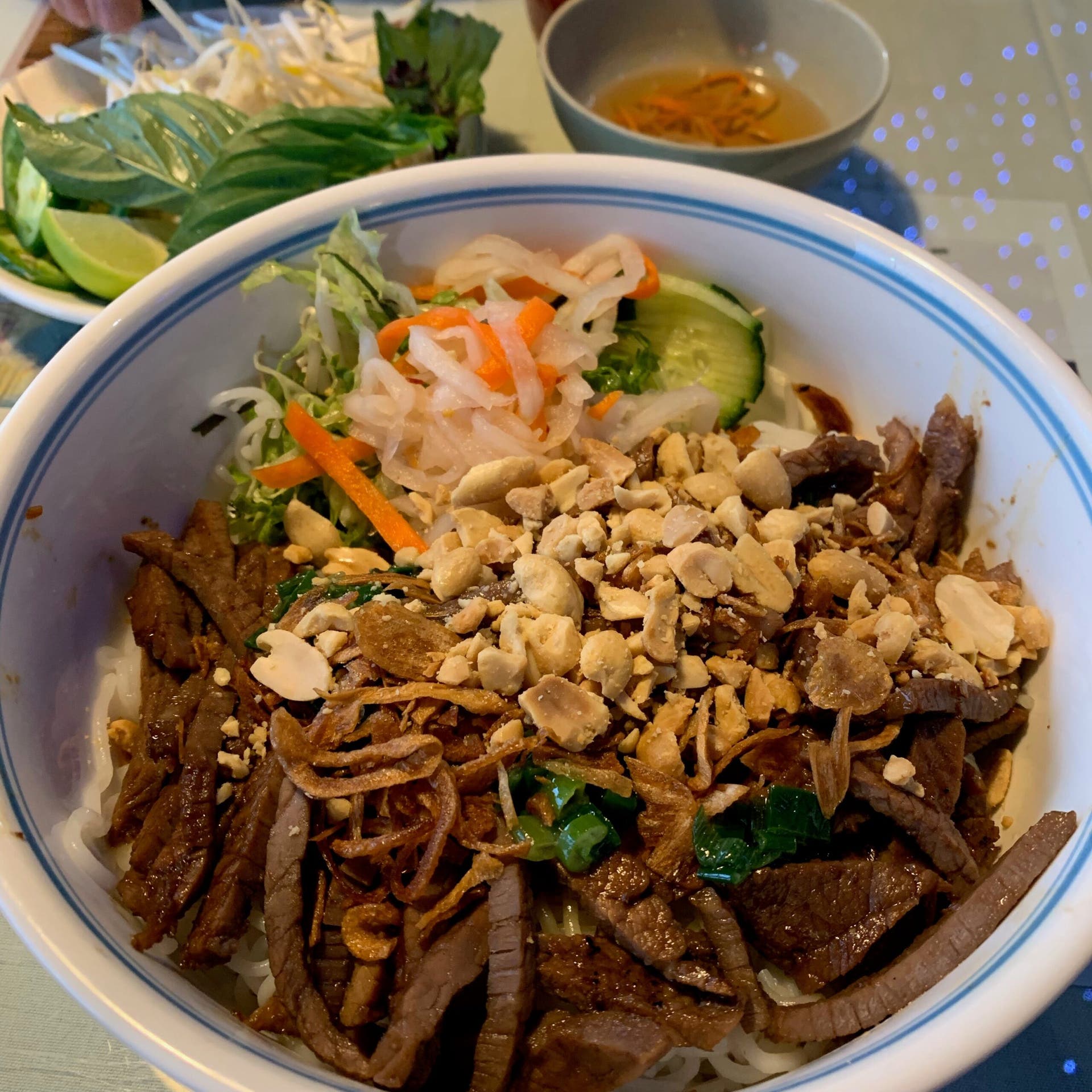Dinner: Beef stir-fry with rice noodles, beef, red peppers, carrots, toasted peanuts, fresh basil, lime, chili-garlic-soy sauce