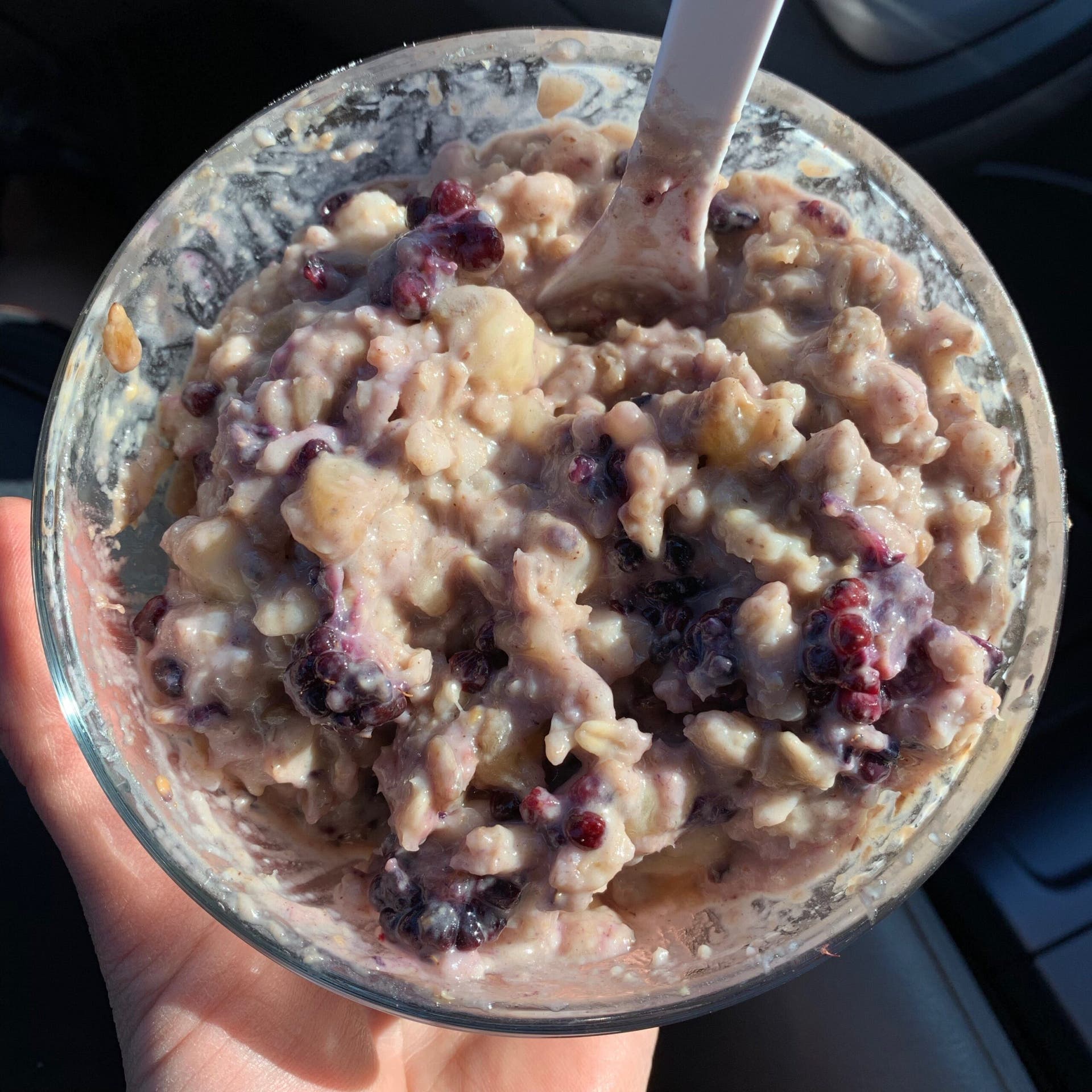 Breakfast: Oatmeal (½ cup oats cooked in milk, with banana, blackberries, peanut butter, sunflower seeds, vanilla protein powder, cinnamon, ginger, cardamom, nutmeg)
